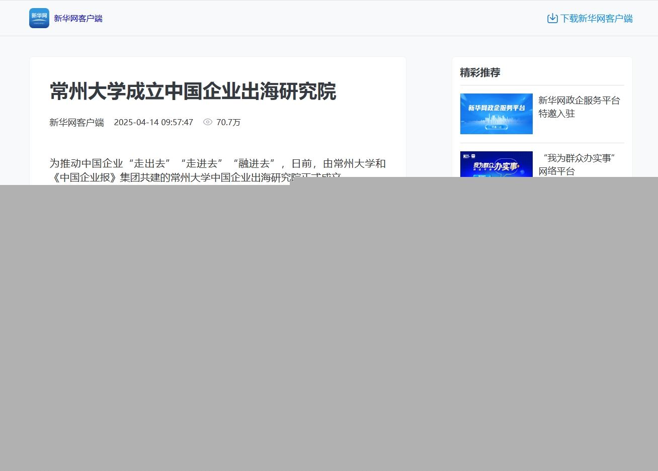 為推動(dòng)中國(guó)企業(yè)“走出去”“走進(jìn)去”“融進(jìn)去”,日前,由常州大學(xué)和《中國(guó)企業(yè)報(bào)》集團(tuán)共建的常州大學(xué)中國(guó)企業(yè)出海研究院正式成立。